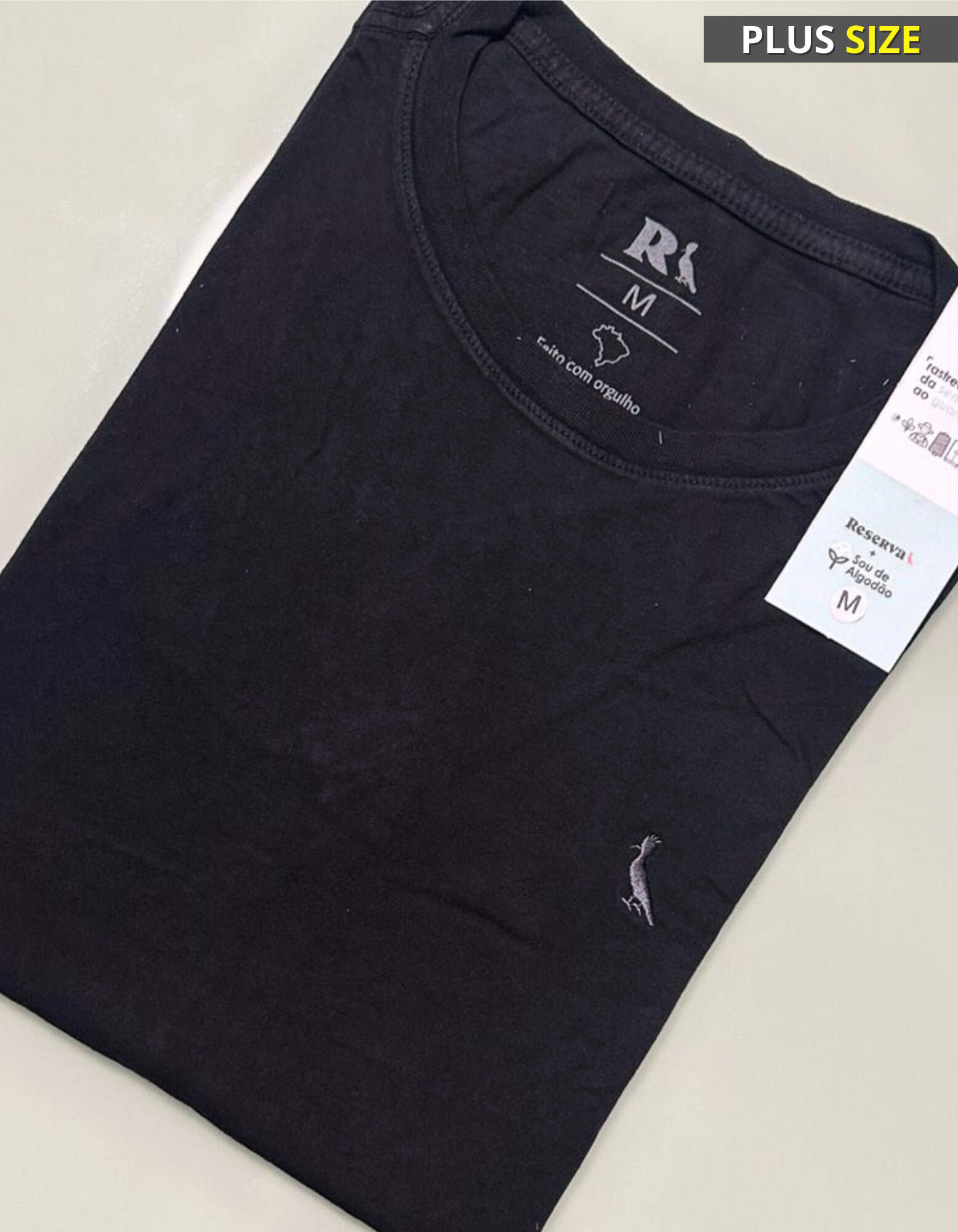 Gola feita com largura mais fina, costuras com reforço ombro a ombro.
